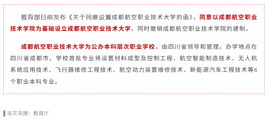 首批6个职业本科专业:材料成型及控制工程、航空智能制造技术、无人机系统应用技术、飞行器维修工程技术、航空动力装置维修技术、新能源汽车工程技术。