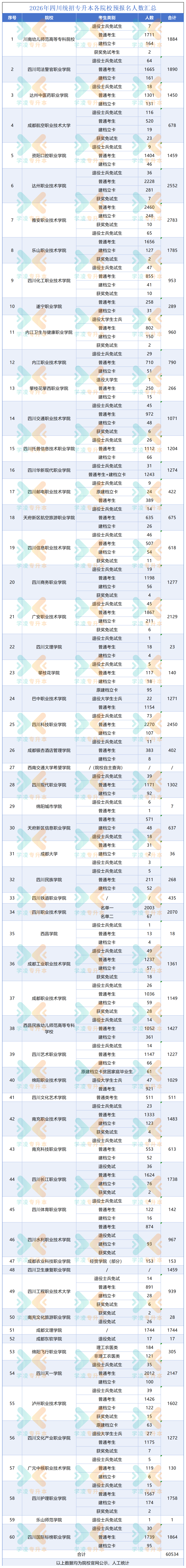 根据已公示院校的预报名数据汇总(未包含全部院校,最终人数以省考试院公布为准),2026年四川专升本预报名人数已突破6万人,较去年同期(2025年64所院校预报名7.3万)虽略有差异,但核心竞争趋势不变。